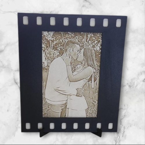 Filmszalag formájú fa képkeret, gravírozott fotóval.