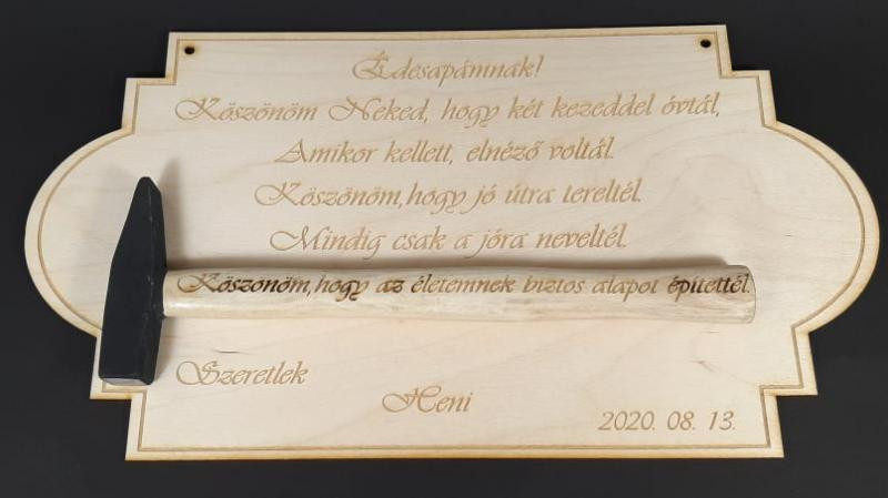 Az impozáns méretű fa tábla (kb. 40 × 24,5 cm) elegáns hátteret ad a gravírozott nevekkel, esküvői dátummal és személyes üzenettel díszített feliratnak, míg a 27 cm hosszú kalapács az építkezés, támogatás és biztonság jelképe.