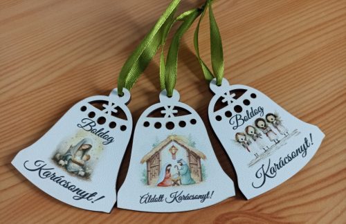 Karácsonyi hangulatot varázsoló harang alakú függő, melyet 6x7 cm-es méretben, 3 mm vastag farostlemezből készült.